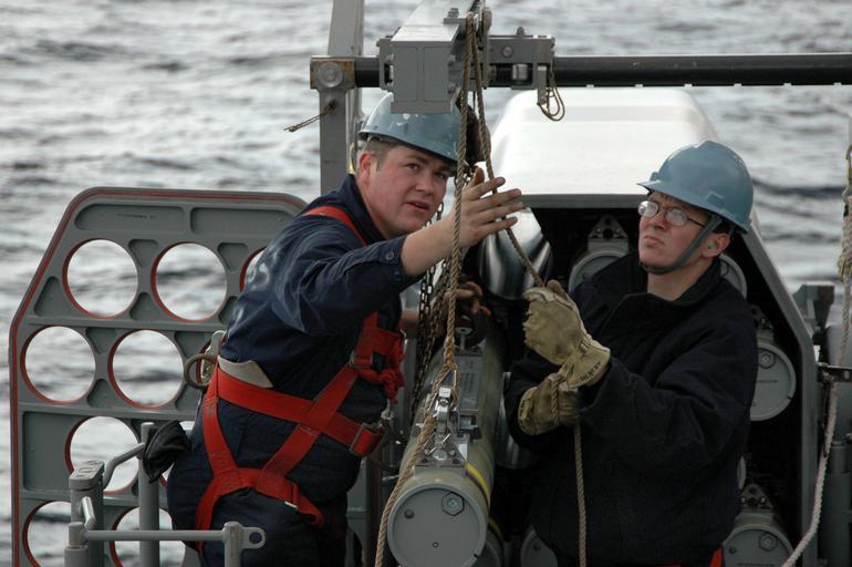Keywords: US Navy 051206-N-6106R-056 Fire Controlman 3rd Class Joseph Gallagher and Fire Controlman 3rd Class Chris Foster download a RIM-116 Rolling Airframe Missile (RAM) from its launcher.jpg en South China Sea Dec 6 2005 - Fire Controlman 3rd Class Joseph Gallagher and Fire Controlman 3rd Class Chris Foster download a RIM-116 Rolling Airframe Missile RAM from its launcher prior to performing a routine maintenance check aboard the conventionally powered aircraft carrier USS Kitty Hawk CV 63 A RAM is a 5-inch missile that utilizes Sidewinder missile technology for the warhead and rocket motor and the Stinger missile's seeker-head The launcher system comes in either a 21-round or an 11-round launcher Kitty Hawk and embarked Carrier Air Wing Five CVW-5 are currently conducting operations in the Western Pacific Ocean U S Navy photo by Photographer's Mate Airman Stephen W Rowe RELEASED 2005-12-06 051206-N-6106R-056 Navy http //www navy mil/view_image asp id 30503 U S Navy photo by Photographer's Mate Airman Stephen W Rowe PD-USGov-Military-Navy Aboard USS Kitty Hawk CV-63 RIM-116 Rolling Airframe Missile Fire Controlman |