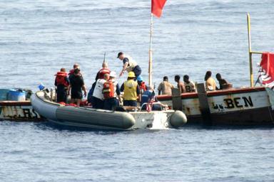 | Keywords: US Navy 060115-N-8637R-004 A rigid hull inflatable boat (RHIB) from the frigate USS Carr (FFG 52) assists a distressed vessel off the coast of Sierra Leone, Africa.jpg en Atlantic Ocean Jan 14 2006 - A rigid hull inflatable boat RHIB from the frigate USS Carr FFG 52 assists a distressed vessel off the coast of Sierra Leone Africa The vessel was spotted by lookouts from the 6th Fleet command and control ship USS Mount Whitney LCC/JCC 20 Both ships were heading for waters off the coast of Monrovia Liberia to help commemorate the inauguration of newly elected President Ellen Johnson Sirleaf on Jan 16 The small craft with a crew of 6 men had been at sea for 35 days and was without a working motor food or water Within two hours crew members dispatched from USS Carr had the vessel moving under its own power and had replenished supplies with enough food and fuel to get the vessel back to land safely U S Navy Photo RELEASED 2006-01-14 060115-N-8637R-004 Navy http //www navy mil/view_image asp id 31249 U S Navy photo PD-USGov-Military-Navy Rigid-hulled inflatable boats Ships in distress Aboard USS Mount Whitney LCC-20 |