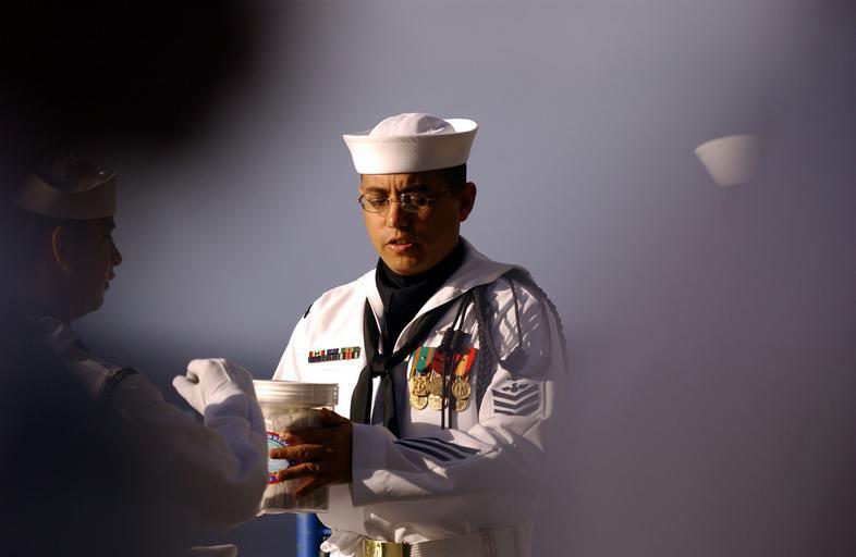 Keywords: US Navy 060129-N-7711S-009 A member of the honor guard presents the ashes of one of twelve veterans being committed to the sea during a burial at sea ceremony held aboard the Nimitz-class aircraft carrier USS Ronald Reagan (CVN.jpg en Pacific Ocean Jan 29 2006 - A member of the honor guard presents the ashes of one of twelve veterans being committed to the sea during a burial at sea ceremony held aboard the Nimitz-class aircraft carrier USS Ronald Reagan CVN 76 Reagan is currently on its maiden deployment in support of the Global war on Terrorism and maritime security operations U S Navy photo by Photographer's Mate Airman Christine Singh RELEASED 2006-01-29 060129-N-7711S-009 Navy http //www navy mil/view_image asp id 31586 U S Navy photo by Photographer's Mate Airman Christine Singh PD-USGov-Military-Navy Sea burials aboard USS Ronald Reagan CVN-76 Sailor caps of the United States Navy |