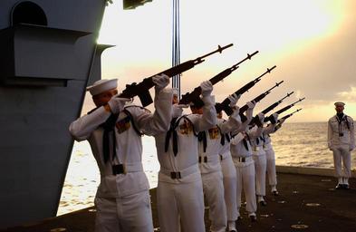 | Keywords: US Navy 060129-N-7711S-071 Members of the honor guard's rifle team fire off a salute to remember twelve veterans during a burial at sea ceremony held aboard the Nimitz-class aircraft carrier USS Ronald Reagan (CVN 76).jpg en Pacific Ocean Jan 29 2006 - Members of the honor guard's rifle team fire off a salute to remember twelve veterans during a burial at sea ceremony held aboard the Nimitz-class aircraft carrier USS Ronald Reagan CVN 76 The ceremony which was also to commemorate the Battle of Coral Sea took place near where the USS Lexington CV 2 was sunk during the battle Reagan is currently on its maiden deployment in support of the global war on terrorism and maritime security operations U S Navy photo by Photographer's Mate Airman Christine Singh RELEASED 2006-01-29 060129-N-7711S-071 Navy http //www navy mil/view_image asp id 31587 U S Navy photo by Photographer's Mate Airman Christine Singh PD-USGov-Military-Navy M14 rifle at sea burials Sea burials aboard USS Ronald Reagan CVN-76 |