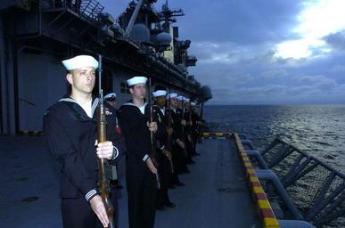 | Keywords: US Navy 060131-N-5067K-047 A ceremonial rifle team stands at a port arms ready to render honors for the burial at sea of the of Chief Engineman James O'Hare Jr. USN Ret.jpg  en East China Sea Jan 31 2006 - A ceremonial rifle team stands at a port arms ready to render honors for the burial at sea of the of Chief Engineman James O'Hare Jr USN Ret Chief Petty Officer O'Hare served in the Navy from 1942 to 1962 during World War ll and the Korean Conflict serving aboard the aircraft carrier USS Essex CV 9 the immediate predecessor to the current amphibious assault ship USS Essex LHD 2 currently serving the Navy today Honoring the request of Winifred O'Hare the widow of Chief O'Hare his remains were scattered to the Deep Blue Sea from the namesake of his much beloved ship U S Navy photo by Photographer's Mate 1st Class Michael D Kennedy RELEASED 2006-01-31 060131-N-5067K-047 Navy http //www navy mil/view_image asp id 31698 U S Navy photo by Photographer's Mate 1st Class Michael D Kennedy PD-USGov-Military-Navy M14 rifle at sea burials Aboard USS Essex LHD-2 |
