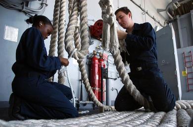 Keywords: US Navy 060305-N-7241L-039 Boatswain's Mate 3rd Class Shaquita Smith, left, and Seaman Patrick Schubert, right, finish splicing a mooring line by tying off loose ends, aboard the Nimitz-class aircraft carrier USS Theodore Roose.jpg en Atlantic Ocean March 5 2006 - Boatswain's Mate 3rd Class Shaquita Smith left and Seaman Patrick Schubert right finish splicing a mooring line by tying off loose ends aboard the Nimitz-class aircraft carrier USS Theodore Roosevelt CVN 71 Roosevelt and embarked Carrier Air Wing Eight CVW-8 are underway on a regularly scheduled deployment conducting maritime security operations U S Navy photo by Photographer's Mate Airman Apprentice Nathan Laird RELEASED 2006-03-05 060305-N-7241L-039 Navy http //www navy mil/view_image asp id 32523 U S Navy photo by Photographer's Mate Airman Apprentice Nathan Laird PD-USGov-Military-Navy Boatswain's Mate United States Navy Aboard USS Theodore Roosevelt CVN-71 Ropework Photographs by Nathan Laird |