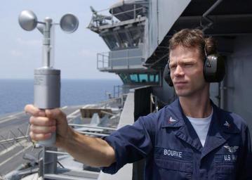 Keywords: US Navy 060508-N-0933M-001 Aerographer's Mate 3rd Class Arthur Bourke measures wind speed and direction with a handheld anemometer on the island aboard the Nimitz-class aircraft carrier USS Dwight D. Eisenhower (CVN 69).jpg en Atlantic Ocean May 8 2006 - Aerographer's Mate 3rd Class Arthur Bourke measures wind speed and direction with a handheld anemometer on the island aboard the Nimitz-class aircraft carrier USS Dwight D Eisenhower CVN 69 Eisenhower and embarked Carrier Air Wing Seven CVW-7 are currently participating in Composite Training Unit Exercise COMPTUEX U S Navy photo by Photographer's Mate 3rd Class Nathaniel Moger RELEASED 2006-05-08 060508-N-0933M-001 Navy http //www navy mil/view_image asp id 34346 U S Navy photo by Photographer's Mate 3rd Class Nathaniel Moger PD-USGov-Military-Navy Aerographer's Mate Flight deck of USS Dwight D Eisenhower CVN-69 People with safety earmuffs Anemometers |
