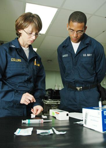 | Keywords: US Navy 060509-N-1577S-081 Lt. Tara Collins of Crestwood, Ky., teaches Hospitalman Vicente Mendez of Brooklyn, N.Y., proper procedures on testing a patient's blood during a skills-a-thon.jpg en Pacific Ocean May 9 2006 - Lt Tara Collins of Crestwood Ky teaches Hospitalman Vicente Mendez of Brooklyn N Y proper procedures on testing a patient's blood during a skills-a-thon aboard Military Sealift Command MSC hospital ship USNS Mercy T-AH 19 The skills a thon was held to test the skills that would be required in a typical hospital setting Mercy is on a five-month deployment during which it will visit areas of South Asia Southeast Asia and the Pacific Islands where its crew and several health and civic-related organizations will work together to aid in humanitarian assistance and civic efforts Mercy is uniquely capable of supporting medical and humanitarian assistance needs and is configured with special medical equipment and a robust multi-specialized medical team to provide a range of services ashore as well as aboard the ship The medical staff is augmented with an assistance crew many of whom are part of non-governmental organizations which have significant medical capabilities U S Navy photo by Photographer's Mate 3rd Class Timothy F Sosa RELEASED 2006-05-09 060509-N-1577S-081 Navy http //www navy mil/view_image asp id 34352 U S Navy photo by Photographer's Mate 3rd Class Timothy F Sosa PD-USGov-Military-Navy Aboard USNS Mercy T-AH-19 |