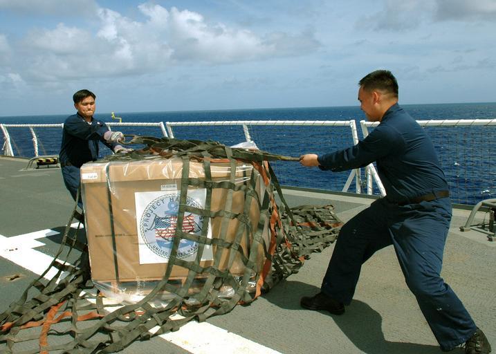 | Keywords: US Navy 060509-N-3714J-054 Two Sailors prepare boxes to be air lifted in support of Project Handclasp from Military Sealift Command (MSC) hospital ship USNS Mercy (T-AH 19).jpg  en Pacific Ocean May 9 2006 - Storekeeper 3rd Class Christian Sabandal of Los Angeles Calif and Storekeeper 3rd Class Rommer Gonzales of San Diego Calif prepare boxes to be air lifted in support of Project Handclasp from Military Sealift Command MSC hospital ship USNS Mercy T-AH 19 Mercy is on a five-month deployment during which it will visit areas of South Asia Southeast Asia and the Pacific Islands where its crew and several health and civic-related organizations will work together to aid in humanitarian assistance and civic efforts Project Handclasp accepts and transports educational humanitarian and goodwill material overseas on a space-available basis in U S Navy ships Materials are distributed directly to needy recipients by U S service personnel stationed in overseas areas or embarked on U S Navy ships which visit these areas Mercy is uniquely capable of supporting medical and humanitarian assistance needs and is configured with special medical equipment and a robust multi-specialized medical team to provide a range of services ashore as well as aboard the ship The medical staff is augmented with an assistance crew many of whom are part of non-governmental organizations which have significant medical capabilities U S Navy photo by Photographer's Mate 2nd Class Erika N Jones RELEASED 2006-05-09 060509-N-3714J-054 Navy http //www navy mil/view_image asp id 34356 U S Navy photo by Photographer's Mate 2nd Class Erika N Jones PD-USGov-Military-Navy Aboard USNS Mercy T-AH-19 Project Handclasp United States Navy |