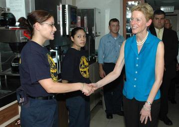 | Keywords: US Navy 060523-N-1577S-051 USNS Mercy Humanitarian Deployment to South East Asia.jpg  en Manila Philippines May 23 2006 - U S Ambassador to the Republic of the Philippines Kristie A Kenney thanks food service attendant Aviation Ordnanceman Airman Carrie Neal for her work aboard the Military Sealift Command MSC hospital ship USNS Mercy T-AH 19 during a scheduled port visit in Manila Mercy is on a five-month deployment during which it will visit areas of South Asia Southeast Asia and the Pacific Islands where its crew and several health and civic related organizations will work together to aid in humanitarian and civic efforts Mercy is uniquely capable of supporting medical and humanitarian assistance needs and has been configured with special medical equipment and a robust multi-specialized medical team to provide a range of services ashore as well as aboard ship The medical staff is augmented with assistance crews many of whom are part of non-governmental organizations and have significant medical capabilities U S Navy photo by PhotographerUs Mate 3rd Class Timothy F Sosa RELEASED 060523-N-1577S-051 Navy http //www navy mil/view_image asp id 34861 U S Navy photo by PhotographerUs Mate 3rd Class Timothy F Sosa PD-USGov-Military-Navy Kristie Kenney Aboard USNS Mercy T-AH-19 |