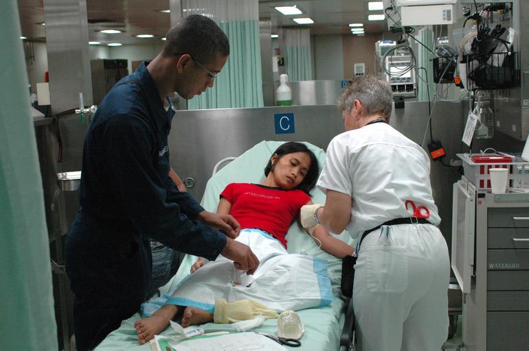 | Keywords: US Navy 060526-N-9076B-099 Hospital Corpsman Vincent Mendas, left, of Brooklyn, NY., helps Project Hope volunteer Diane Speranza of Claremont Fla., draw blood in the casualty receiving (CASREC) ward.jpg en Zamboanga Republic of the Philippines May 26 2006 Hospital Corpsman Vincent Mendas left of Brooklyn NY helps Project Hope volunteer Diane Speranza of Claremont Fla draw blood in the casualty receiving CASREC ward aboard the Military Sealift Command MSC hospital ship USNS Mercy T-AH 19 while anchored off the Philippine coast For the next several days the ship will be conducting humanitarian and civic assistance in the local area Mercy is on a five-month deployment to South Asia Southeast Asia and the Pacific Islands Mercy s medical crew will provide general and ophthalmology surgery basic medical evaluation and treatment preventive medicine treatment dental screenings and treatment optometry screenings eyewear distribution public health training and veterinary services as requested by the host nations Mercy is uniquely capable of supporting medical and humanitarian assistance needs and is configured with special medical equipment and a robust multi-specialized medical team that can provide a range of services ashore as well as aboard the ship The medical staff is augmented with an assistance crew many of whom are part of non-governmental organizations that have significant medical capabilities U S Navy photo by Chief Photographer's Mate Don Bray RELEASED 2006-05-26 060526-N-9076B-099 Navy http //www navy mil/view_image asp id 35061 U S Navy photo by Chief Photographer's Mate Don Bray PD-USGov-Military-Navy United States Navy in Zamboanga City Aboard USNS Mercy T-AH-19 |