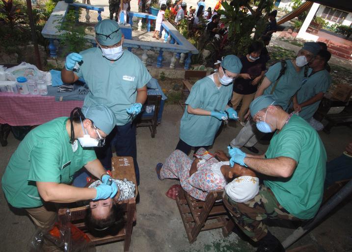 | Keywords: US Navy 060528-N-8391L-462 U.S. Navy Dentist Cmdr. Jan DeLorey-Lytle, left and Air Force Dentist Lt. Col. Gary Leake, right, work side-by-side performing tooth extractions during a dental assistance mission.jpg  en Zamboanga Republic of the Philippines May 28 2006 -U S Navy Dentist Cmdr Jan DeLorey-Lytle left and Air Force Dentist Lt Col Gary Leake right work side-by-side performing tooth extractions during a dental assistance mission at the local Recodo Elementary School Both are assigned to the Military Sealift Command MSC hospital ship USNS Mercy T-AH 19 For the next several days the Mercy's crew and non-governmental organizations will be conducting humanitarian work in the local area Mercy is on a five-month deployment to South Asia Southeast Asia and the Pacific Islands and the medical crew aboard Mercy will provide general and ophthalmology surgery basic medical evaluation and treatment preventive medicine treatment dental screenings and treatment optometry screenings eyewear distribution public health training and veterinary services as requested by the host nations Mercy is uniquely capable of supporting medical and humanitarian assistance needs and is configured with special medical equipment and a robust multi-specialized medical team who can provide a range of services ashore as well as aboard the ship The medical staff is augmented with an assistance crew many of whom are part of non-governmental organizations that have significant medical capabilities U S Navy photograph by Photographer's Mate 2nd Class Troy Latham Released 2006-05-28 060528-N-8391L-462 Navy http //www navy mil/view_image asp id 35139 U S Navy photo PD-USGov-Military-Navy United States Navy in Zamboanga City Aboard USNS Mercy T-AH-19  |
