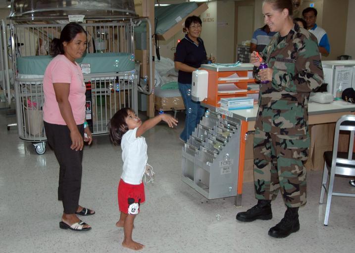 Keywords: US Navy 060531-N-9076B-055 Air Force Senior Airman Danielle Fahlbush of Harrisburg, Pa., entertains a little girl in the recovery ward.jpg en Zamboanga Philippines May 31 2006 - Air Force Senior Airman Danielle Fahlbush of Harrisburg Pa entertains a little girl in the recovery ward aboard the U S Military Sealift Command MSC hospital ship USNS Mercy T-AH 19 Mercy's one week stay in Zamboanga will provide a multitude of medical dental and veterinary care for the people who live in this region This care is provided by a portion of Mercy's staff working side by side with their Filipino counterparts at several medical centers in the city as well as patients being given care on the ship itself Mercy's stop in Zamboanga is the first of many during its humanitarian deployment to South and Southeast Asia and the Pacific Islands Mercy is able to rapidly respond to a range of situations on short notice and is capable of supporting medical and humanitarian assistance needs with special medical equipment and a multi-specialized medical team providing a range of services ashore as well as aboard the ship The medical staff is augmented with an assistance crew many of whom are part of non-governmental organizations that have significant medical capabilities U S Navy photo by Chief Photographer's Mate Don Bray RELEASED 2006-05-31 060531-N-9076B-055 Navy http //www navy mil/view_image asp id 35316 U S Navy photo by Chief Photographer's Mate Don Bray PD-USGov-Military-Navy United States Navy in Zamboanga City Aboard USNS Mercy T-AH-19 |