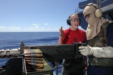 Keywords: US Navy 060612-N-3946H-060 Gunner's Mate 2nd Class Teresa Keener instructs a Sailor assigned to the Weapons Department on the operation of a .50-caliber machine gun.jpg en Pacific Ocean June 12 2006 - Gunner's Mate 2nd Class Teresa Keener instructs a Sailor assigned to the Weapons Department on the operation of a 50-caliber machine gun during a live fire exercise on the fantail aboard the conventionally-powered aircraft carrier USS Kitty Hawk CV 63 Currently under way in the 7th Fleet area of responsibility AOR Kitty Hawk demonstrates power projection and sea control as the U S Navy's only permanently forward-deployed aircraft carrier operating from Yokosuka Japan U S Navy photo by Photographer's Mate Airman Patrick L Heil RELEASED 2006-06-12 060612-N-3946H-060 Navy http //www navy mil/view_image asp id 35745 U S Navy photo by Photographer's Mate Airman Patrick L Heil PD-USGov-Military-Navy Browning M2 of the US Navy Keener family Aboard USS Kitty Hawk CV-63 Gunner's Mate |