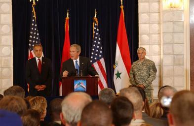 | Keywords: US Navy 060613-N-0000X-002 U.S. Ambassador to Iraq Zalmay Khalilzad, left, and Commanding General, Multinational Forces-Iraq Gen. George Casey, right, listen to U.S. President George W. Bush.jpg en Iraq June 13 2006 - U S Ambassador to Iraq Zalmay Khalilzad left and Commanding General Multinational Forces-Iraq Gen George Casey right listen as U S President George W Bush commends U S and coalition forces for their continuing efforts at a former presidential palace of Saddam Hussein in Baghdad's International Zone U S Navy photo by Chief Journalist Darrell Crandall RELEASED 2006-06-13 060613-N-0000X-002 Navy http //www navy mil/view_image asp id 36003 U S Navy photo by Chief Journalist Darrell Crandall PD-USGov-Military-Navy United States Navy in the Iraq War George W Bush in 2006 George W Bush with military people George W Bush in the Iraq War Zalmay Khalilzad George W Casey Jr |
