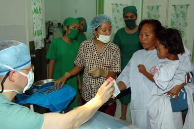 | Keywords: US Navy 060613-N-3532C-035 Navy Lt. Cmdr. Vernon Sechriest, a surgeon with the Medical Treatment Facility aboard the U.S. Military Sealift Command (MSC) Hospital Ship USNS Mercy (T-AH 19), gives children^rsquo,s pain medication.jpg en Tawi Tawi Philippines June 13 2006 Navy Lt Cmdr Vernon Sechriest a surgeon with the Medical Treatment Facility aboard the U S Military Sealift Command MSC Hospital Ship USNS Mercy T-AH 19 gives children s pain medication to a local mother whose daughter underwent minor surgery at Datu Halun Sakilan Memorial Hospital As part of its five-month humanitarian assistance deployment to South and Southeast Asia and the Pacific Islands the crew aboard Mercy will spend several days delivering medical care to local residents The crew will conduct medical operations ashore and aboard ship where they will provide general and ophthalmology surgery basic medical evaluation and treatment preventive medicine treatment dental screenings and treatment optometry screenings eyewear distribution public health training and veterinary services as requested by the host nations Mercy is uniquely capable of supporting medical and humanitarian assistance needs and is configured with special medical equipment and a robust multi-specialized medical team that can provide a range of services ashore as well as aboard the ship The medical staff is augmented with an assistance crew many of whom are part of nongovernmental organizations that have significant medical capabilities U S Navy photo by Journalist Seaman Joseph Caballero RELEASED 2006-06-13 060613-N-3532C-035 Navy http //www navy mil/view_image asp id 35759 U S Navy photo by Journalist Seaman Joseph Caballero PD-USGov-Military-Navy Images from US Navy location Tawi-Tawi Philippines Aboard USNS Mercy T-AH-19 |