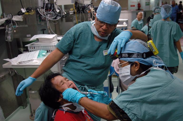 | Keywords: US Navy 060615-N-2832L-052 edical Treatment Facility aboard the U.S. Military Sealift Command (MSC) Hospital Ship USNS Mercy (T-AH 19).jpg  en Tawi Tawi Philippines June 15 2006 - Capt Warlito Chee a Philippine Marine doctor and Manila native with the Medical Treatment Facility aboard the U S Military Sealift Command MSC Hospital Ship USNS Mercy T-AH 19 works with Dr Enriquez a volunteer from the city to remove a tooth from a patient during a Medical Civil Action Project MEDCAP while the ship visits the city on a scheduled humanitarian mission The medical crew aboard Mercy will provide general and ophthalmology surgery basic medical evaluation and treatment preventive medicine treatment dental screenings and treatment optometry screenings eyewear distribution public health training and veterinary services as requested by the host nations Mercy is uniquely capable of supporting medical and humanitarian assistance needs and is configured with special medical equipment and a robust multi-specialized medical team who can provide a range of services ashore as well as aboard the ship The medical staff is augmented with an assistance crew many of whom are part of non-governmental organizations which have significant medical capabilities Mercy is on a five-month deployment to South Asia Southeast Asia and the Pacific Islands U S Navy photo by Journalist Seaman Apprentice Mike Leporati RELEASED 2006-06-15 060615-N-2832L-052 Navy http //www navy mil/view_image asp id 35846 U S Navy photo by Journalist Seaman Apprentice Mike Leporati PD-USGov-Military-Navy Images from US Navy location Tawi-Tawi Philippines Aboard USNS Mercy T-AH-19  |