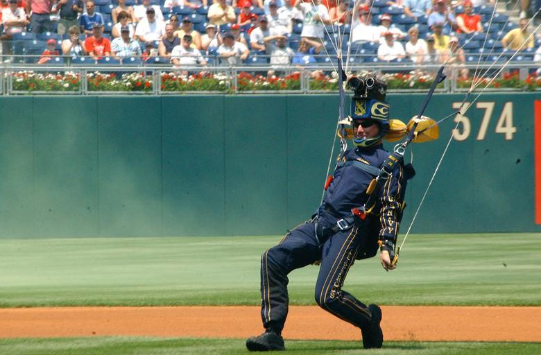 | Keywords: US Navy 060618-N-4729H-087 Chief Damage Controlman J.C. Ledbetter assigned to the Navy Parachute Team Leapfrogs, hits the ground at Citizens Bank Park.jpg  en Philadelphia June 18 2006 - Chief Damage Controlman J C Ledbetter assigned to the Navy Parachute Team Leapfrogs hits the ground at Citizens Bank Park during the Philadelphia Phillies' pre-game Father's Day show A video camera attached to Ledbetter's helmet captured the performance as he landed in the infield and received cheering welcome from the Philadelphia fans Several of Leapfrogs team members delivered game balls to the team one of which was used as the first pitch thrown by Supreme Court Justice Samuel Alito The Leapfrogs were in town performing on board Naval Air Station Joint Reserve Base Willow Grove Air Show over the weekend U S Navy photo by Chief Journalist Monica Hallman RELEASED 2006-06-18 060618-N-4729H-087 Navy http //www navy mil/view_image asp id 36028 U S Navy photo by Chief Journalist Monica Hallman PD-USGov-Military-Navy Images from US Navy location Philadelphia PA Damage Controlman |