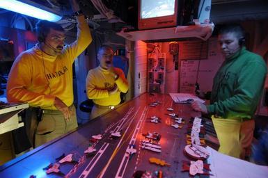 Keywords: US Navy 060622-N-3136P-090 Flight Deck Control Handler, Lt. Cmdr. Gil Mucke and Assistant Flight Deck Control Officer, Lt. Alberto Dones monitor the movement of aircraft on the ouji board.jpg en Philippine Sea June 22 2006 - Flight Deck Control Handler Lt Cmdr Gil Mucke and Assistant Flight Deck Control Officer Lt Alberto Dones monitor the movement of aircraft on the ouji board in the flight deck control center during night-time flight operations aboard the conventionally-powered aircraft carrier USS Kitty Hawk CV 63 The Kitty Hawk Carrier Strike group is currently participating in Valiant Shield 2006 Valiant Shield focuses on integrated joint training among U S military forces enabling real-world proficiency in sustaining joint forces and in detecting locating tracking and engaging units at sea in the air on land and cyberspace in response to a range of mission areas U S Navy photo by Photographer's Mate Airman Jimmy C Pan RELEASED 2006-06-22 060622-N-3136P-090 Navy http //www navy mil/view_image asp id 36115 U S Navy photo by Photographer's Mate Airman Jimmy C Pan PD-USGov-Military-Navy Ouija boards aircraft carrier Valiant Shield 2006 Aboard USS Kitty Hawk CV-63 |