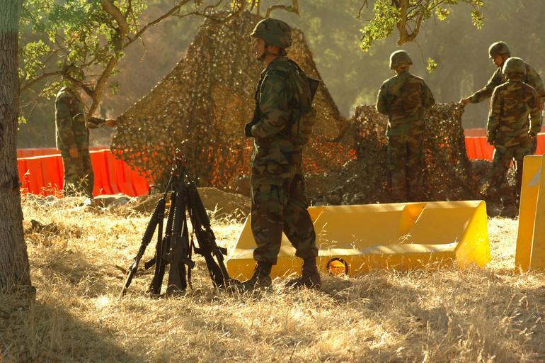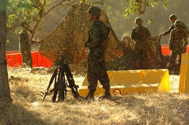 Keywords: US Navy 060817-N-0775Y-007 Storekeeper Seaman Apprentice Travis Clanton stands a weapons watch while the rest of his crew places camouflage netting over a defensive position at the entrance of the Logistics Support Area.jpg en Fort Hunter Liggett Calif Aug 17 2006 - Storekeeper Seaman Apprentice Travis Clanton stands a weapons watch while the rest of his crew places camouflage netting over a defensive position at the entrance of the Logistics Support Area LSA Seabees from Naval Mobile Construction Battalion THREE are conducting a three-week field exercise FEX at Fort Hunter Liggett Calif known as Operation Bearing Duel U S Navy photo by Mass Communication Specialist 1st Class Carmichael Yepez RELEASED 2006-08-17 060817-N-0775Y-007 Navy http //www navy mil/view_image asp id 38803 U S Navy photo by Mass Communication Specialist 1st Class Carmichael Yepez PD-USGov-Military-Navy Fort Hunter Liggett Camouflage nettings Naval Mobile Construction Battalion 3 Operation Bearing Duel 2006 |