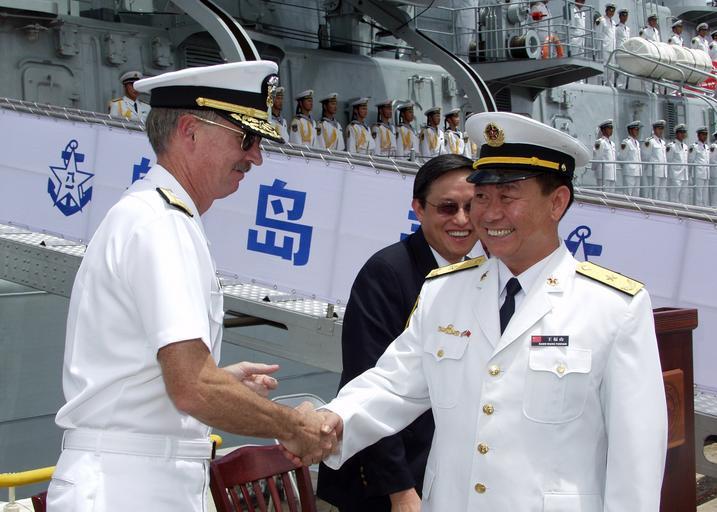 | Keywords: US Navy 060906-N-0879R-006 Commander, Navy Region Hawaii, Rear Adm. T. G. Alexander greets Deputy Commander, North Sea Fleet, Rear Adm. Wang Fushan following the arrival of two ships representing China's Navy.jpg en Pearl Harbor Hawaii Sept 6 2006 - Commander Navy Region Hawaii Rear Adm T G Alexander greets Deputy Commander North Sea Fleet Rear Adm Wang Fushan following the arrival of two ships representing China's Navy the destroyer Qingdao DDG 113 and the oiler Hongzehu AOR 881 The ships arrived in Pearl Harbor for a routine port visit U S Navy photo by Chief Mass Communication Specialist David Rush RELEASED 2006-09-06 060906-N-0879R-006 Navy http //www navy mil/view_image asp id 38898 U S Navy photo by Chief Mass Communication Specialist David Rush 2006 in Pearl Harbor Admirals of the People's Liberation Army Navy Handshakes involving the military PD-USGov-Military-Navy |
