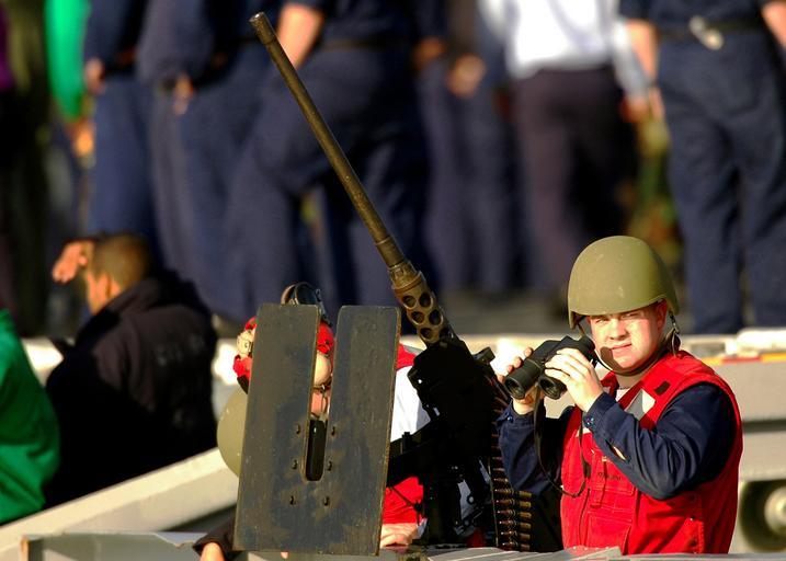 | Keywords: US Navy 061022-N-0490C-003 Aviation Ordnanceman Airman Anthony Baka stands a force protection watch off the ship^rsquo,s flight deck aboard the Nimitz-class aircraft carrier USS Dwight D. Eisenhower (CVN 69), while transiting t.jpg en Mediterranean Sea Oct 22 2006 Aviation Ordnanceman Airman Anthony Baka stands a force protection watch off the ship s flight deck aboard the Nimitz-class aircraft carrier USS Dwight D Eisenhower CVN 69 while transiting the Strait of Messina Dwight D Eisenhower flagship for Carrier Strike Group CSG 8 recently departed Naples Italy following a scheduled four-day port visit Eisenhower departed her homeport of Norfolk Va on Oct 3 for a regularly scheduled deployed in support of Maritime Security Operations MSO Embarked aboard IKE are aircraft assigned to Carrier Air Wing CVW 7 U S Navy photo by Mass Communication Specialist 2nd Class Miguel Angel Contreras RELEASED 2006-10-22 061022-N-0490C-003 Navy http //www navy mil/view_image asp id 40119 U S Navy photo by Mass Communication Specialist 2nd Class Miguel Angel Contreras PD-USGov-Military-Navy Aviation Ordnanceman Aboard USS Dwight D Eisenhower CVN-69 |