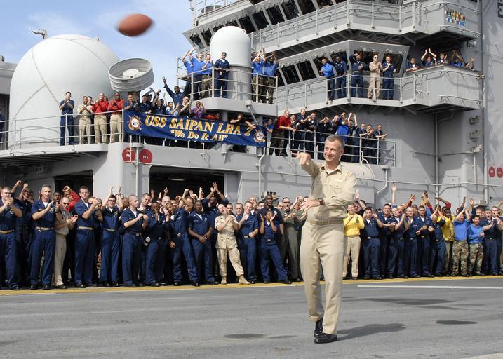 Keywords: US Navy 061101-N-0938S-089 Capt. Richard D. Fitzpatrick, commanding officer of amphibious assault ship USS Saipan (LHA 2), leads his crew in a moment of revelry during a video shoot for a promotional spot for the upcoming Army.jpg en Arabian Gulf Nov 1 2006 - Capt Richard D Fitzpatrick commanding officer of amphibious assault ship USS Saipan LHA 2 leads his crew in a moment of revelry during a video shoot for a promotional spot for the upcoming Army/Navy college football game Dec 2 2006 Saipan is currently on deployment in the 5th Fleet area of responsibility AOR conducting maritime security operations MSO in the Gulf of Aden Gulf of Oman Arabian Sea Red Sea and Indian Ocean U S Navy photo by Mass Communication Specialist 3rd Class Erik Siegel RELEASED 2006-11-01 061101-N-0938S-089 Navy http //www navy mil/view_image asp id 40477 U S Navy photo by Mass Communication Specialist 3rd Class Erik Siegel PD-USGov-Military-Navy Aboard USS Saipan LHA-2