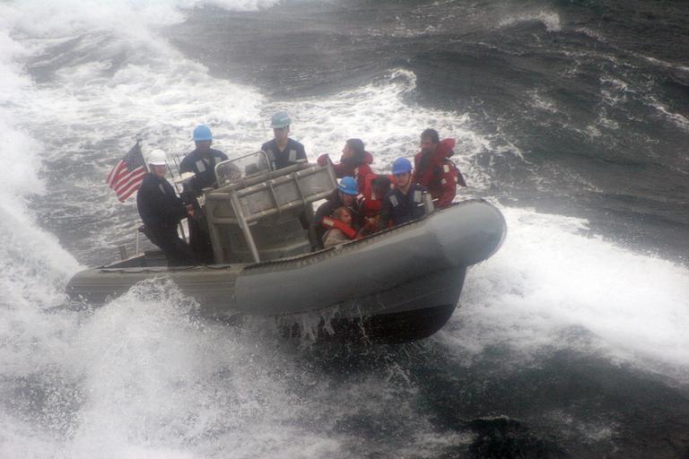 Keywords: US Navy 061201-N-6423H-009 A boat crew from the amphibious transport dock ship USS San Antonio (LPD 17) returns to the ship after rescuing the crew of the fishing vessel Miss Melissa.jpg en Atlantic Ocean Dec 1 2006 - A boat crew from the amphibious transport dock ship USS San Antonio LPD 17 returns to the ship after rescuing the crew of the fishing vessel Miss Melissa which was taking on water in heavy seas and 40-knot winds The ship s Commanding Officer Cmdr Brad Lee answered Miss Melissa s distress call immediately deploying a crew of five personnel in a ridged hull inflatable boat RHIB to retrieve the crew later sending a team back to the fishing vessel to assist with dewatering efforts The Coast Guard later towed the boat back to port The rescued crew was brought aboard San Antonio and provided dry clothing food and an opportunity to make phone calls home U S Navy photo by Mass Communication Specialist 1st Class Erik Hoffmann RELEASED 2006-12-01 061201-N-6423H-009 Navy http //www navy mil/view_image asp id 41273 U S Navy photo by Mass Communication Specialist 1st Class Erik Hoffmann PD-USGov-Military-Navy Aboard USS San Antonio LPD 17 |