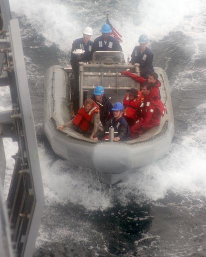 Keywords: US Navy 061201-N-6423H-010 A boat crew from the amphibious transport dock ship USS San Antonio (LPD 17) returns to the ship after rescuing the crew of the fishing vessel Miss Melissa.jpg en Atlantic Ocean Dec 1 2006 - A boat crew from the amphibious transport dock ship USS San Antonio LPD 17 returns to the ship after rescuing the crew of the fishing vessel Miss Melissa which was taking on water in heavy seas and 40-knot winds The ship s Commanding Officer Cmdr Brad Lee answered Miss Melissa s distress call immediately deploying a crew of five personnel in a ridged hull inflatable boat RHIB to retrieve the crew later sending a team back to the fishing vessel to assist with dewatering efforts The Coast Guard later towed the boat back to port The rescued crew was brought aboard San Antonio and provided dry clothing food and an opportunity to make phone calls home U S Navy photo by Mass Communication Specialist 1st Class Erik Hoffmann RELEASED 2006-12-01 061201-N-6423H-010 Navy http //www navy mil/view_image asp id 41274 U S Navy photo by Mass Communication Specialist 1st Class Erik Hoffmann PD-USGov-Military-Navy Aboard USS San Antonio LPD 17 |