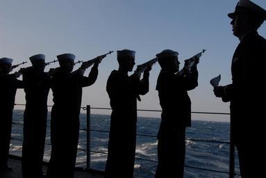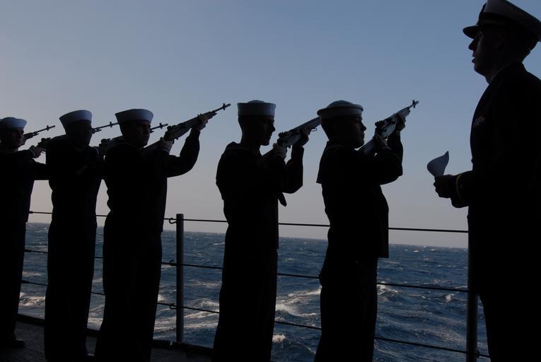 Keywords: US Navy 061202-N-7312S-001 Ensign Christopher Pisani instructs the ship^rsquo,s Honor Guard to fire during a burial at sea for three military working dogs from Commander, Fleet Activities Yokosuka Security department..jpg en Pacific Ocean Dec 2 2006 - Ensign Christopher Pisani instructs the ship s Honor Guard to fire during a burial at sea for three military working dogs from Commander Fleet Activities Yokosuka Security department The remains of Max Art and Connor were accompanied by military dog handlers Chief Master-at-Arms Maria E Soto Master-at-Arms 1st Class Michael B Thomas and Master-at-Arms 3rd Class Mark Anthony Garcia respectively The ceremony took place aboard USS Blue Ridge LCC 19 currently underway in support of bilateral exercise Terminal Fury U S Navy photo by Mass Communication Specialist Seaman Jesse Shuey RELEASED 2006-12-02 061202-N-7312S-001 Navy http //www navy mil/view_image asp id 41334 U S Navy photo by Mass Communication Specialist Seaman Jesse Shuey PD-USGov-Military-Navy Aboard USS Blue Ridge LCC-19 M14 rifle at sea burials |