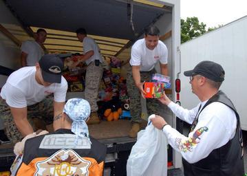 Keywords: US Navy 061203-N-4965F-001 Master Chief Petty Officer Steve Hady (right) assigned to Commander, Submarine Force U.S. Pacific Fleet, hands toys to Sgt. David Herrera.jpg en Pearl Harbor Hawaii Dec 3 2006 - Master Chief Petty Officer Steve Hady right assigned to Commander Submarine Force U S Pacific Fleet hands toys to Sgt David Herrera Staff Sgt John Hassel Staff Sgt Robert Marchand and Staff Sgt Marco Garcia from the 4th Marine Division 4th Force Reconnaissance Company Marine Corps Base Hawaii during the 32nd annual Street Bikers United Toy Run Parade Toys for Tots ride This year's Toys for Tots motorcycle ride gathered more than 6 000 military and civilian motorcyclists and was the largest motorcycle event ever on the island of Oahu The annual event generates approximately one quarter of all toys donated all year from Hawaii and will provide Christmas gifts for more than 20 000 children U S Navy photo by Mass Communication Specialist James E Foehl RELEASED 2006-12-03 061203-N-4965F-001 Navy http //www navy mil/view_image asp id 41349 U S Navy photo by Mass Communication Specialist James E Foehl PD-USGov-Military-Navy 65th anniversary of Pearl Harbor attack
