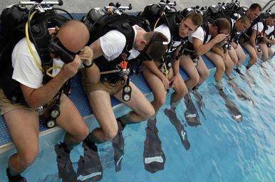 | Keywords: US Navy 061206-G-3721C-769 Students at the Naval Diving and Salvage Training Center prepare to dive in a 12-foot pool for training.jpg en Panama City Fla Dec 6 2006 - Students at the Naval Diving and Salvage Training Center prepare to dive in a 12-foot pool for training Twenty-five students are enrolled in the training center's scuba course and if they successfully complete the course they will re-enter the fleet as military-certified scuba divers U S Coast Guard photo by Petty Officer 1st Class NyxoLyno Cangemi RELEASED 2006-12-06 061206-G-3721C-769 Navy http //www navy mil/view_image asp id 41566 U S Navy photo PD-USGov-Military-Navy Naval Diving and Salvage Training Center |