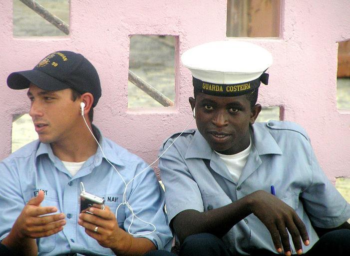 Keywords: US Navy 070308-N-6783N-017 Seaman Apprentice Dustin Eckhart shares a friendly moment with a coast guardsman from S&-195;&-163;o Tom&-195;&-169; and Pr&-195;&-173;ncipe.jpg en SÃO TOMÉ AND PRÍNCIPE March 8 2007 - Seaman Apprentice Dustin Eckhart shares a friendly moment with a coast guardsman from São Tomé and Príncipe A native of Columbus Ind Eckhart was waiting at fleet landing to return to guided missile frigate USS Kauffman FFG 59 when he was approached by the local sailor and asked what kind of music American Sailors listen to Rather than tell him Eckhart shared the iPod with his new shipmate so he could listen along Currently deployed to the Gulf of Guinea Kauffman conducted a four-day port visit to the African island nation of São Tomé and Príncipe to strengthen maritime partnerships U S Navy photo by Lt William Nesbitt RELEASED 2007-03-08 070308-N-6783N-017 Navy http //www navy mil/view_image asp id 44229 U S Navy photo by Lt William Nesbitt PD-USGov-Military-Navy United States Navy in São Tomé and Príncipe |
