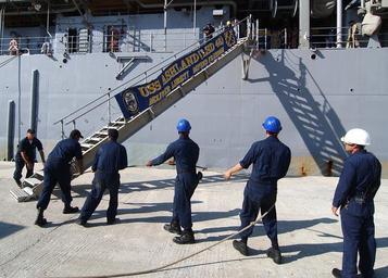 | Keywords: US Navy 070430-N-0780F-003 Sailors aboard Whidbey Island-class dock landing ship USS Ashland (LSD 48) move their starboard accommodation ladder into place as they arrive for a routine port visit.jpg en SOUDA BAY Crete April 30 2007 - Sailors aboard Whidbey Island-class dock landing ship USS Ashland LSD 48 move their starboard accommodation ladder into place as they arrive for a routine port visit Ashland is homeported at Navy Amphibious Base Little Creek Va and is deployed in support of Maritime Security Operations Ashland is an amphibious warfare ship designed to transport Marines and their combat gear throughout the world and then to launch and support assault landing craft and helicopters during amphibious operations against hostile shores U S Navy photo by Mr Paul Farley RELEASED 2007-04-30 070430-N-0780F-003 Navy http //www navy mil/view_image asp id 45611 U S Navy photo by Mr Paul Farley PD-USGov-Military-Navy Naval Support Activity Souda Bay Aboard USS Ashland LSD-48 Gangways watercraft |