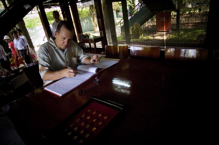 Keywords: US Navy 070620-N-0696M-049 Chief of Naval Operations (CNO) Adm. Mike Mullen signs a guest book after touring a cottage used by Vietnamese President Ho Chi Minh.jpg en HANOI Vietnam June 20 2007 - Chief of Naval Operations CNO Adm Mike Mullen signs a guest book after touring a cottage used by Vietnamese President Ho Chi Minh during his visit to Vietnam Mullen is on a seven-day trip to Japan and Vietnam to visit with foreign leaders and Sailors stationed in the region U S Navy photo by Mass Communication Specialist 1st Class Chad J McNeeley RELEASED 2007-06-20 070620-N-0696M-049 Navy http //www navy mil/view_image asp id 47350 U S Navy photo by Mass Communication Specialist 1st Class Chad J McNeeley PD-USGov-Military-Navy Guestbook signing Michael G Mullen in 2007 Images from US Navy location Hanoi Vietnam Ho Chi Minh House |