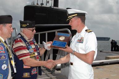 Keywords: US Navy 070622-N-1522S-014 Fast-attack submarine USS Jacksonville (SSN 699) Commanding Officer, Cmdr. John Kropcho receives a plaque celebrating their visit to Jacksonville, Fla., from the United States Submarine Veterans, Inc.jpg en MAYPORT Fla June 22 2007 Fast-attack submarine USS Jacksonville SSN 699 Commanding Officer Cmdr John Kropcho receives a plaque celebrating their visit to Jacksonville Fla from the United States Submarine Veterans Inc Holland Club after the submarine moored pier side at Naval Station Mayport Homeported in Norfolk Va this submarine's namesake invokes a special connection to the people of Jacksonville U S Navy photo by Mass Communication Specialist 2nd Class Leah Stiles RELEASED 2007-06-22 070622-N-1522S-014 Navy http //www navy mil/view_image asp id 47538 U S Navy photo by Mass Communication Specialist 2nd Class Leah Stiles PD-USGov-Military-Navy Naval Station Mayport USS Jacksonville SSN-699 |