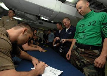 Keywords: US Navy 070713-N-8923M-164 Ultimate Fighting Championship (UFC) fighter Rich Franklin signs his name for a Sailor during an autograph session on the mess decks aboard Nimitz-class aircraft carrier USS Harry S. Truman (CVN 75).jpg en ATLANTIC OCEAN July 13 2007 - Ultimate Fighting Championship UFC fighter Rich Franklin signs his name for a Sailor during an autograph session on the mess decks aboard Nimitz-class aircraft carrier USS Harry S Truman CVN 75 Dr Michael Gervais President of Pinnacle Performance Center Inc ; UFC fighters Rich Franklin and Mike Pyle; and UFC referee Big John McCarthy visited the Truman for two days to help increase morale for the Sailors Truman is underway in the Atlantic Ocean participating in the Composite Training Unit Exercise COMTUEX in preparation for deployment to the Persian Gulf U S Navy photo by Seaman Kevin T Murray Jr RELEASED 2007-07-13 070713-N-8923M-164 Navy http //www navy mil/view_image asp id 48295 U S Navy photo by Seaman Kevin T Murray Jr PD-USGov-Military-Navy Aboard USS Harry S Truman CVN-75 Rich Franklin |