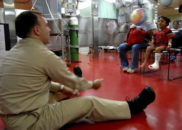 Keywords: US Navy 070722-N-6278K-012 Capt. Bob Kapcio, mission commander aboard Military Sealift Command hospital ship USNS Comfort (T-AH 20), plays with Darwin Padilla before he goes back home.jpg en PACIFIC OCEAN July 22 2007 - Capt Bob Kapcio mission commander aboard Military Sealift Command hospital ship USNS Comfort T-AH 20 plays with Darwin Padilla before he goes back home Padilla underwent surgery aboard Comfort to remove an extra toe Padilla had trouble wearing closed-toed shoes and running with the extra digit and was screened by Comfort's medical staff at Jose Schendal Health Center in Corinto Nicaragua where they decided the boy needed surgery Comfort is on a four-month humanitarian deployment to Latin America and the Caribbean to provide medical treatment to patients in a dozen countries While deployed Comfort is under operational control of U S Naval Forces Southern Command and tactical control of Destroyer Squadron 24 U S Navy photo by Mass Communication Specialist 2nd Class Joan Kretschmer RELEASED 2007-07-22 070722-N-6278K-012 Navy http //www navy mil/view_image asp id 48574 U S Navy photo by Mass Communication Specialist 2nd Class Joan Kretschmer PD-USGov-Military-Navy Aboard USNS Comfort T-AH-20 |