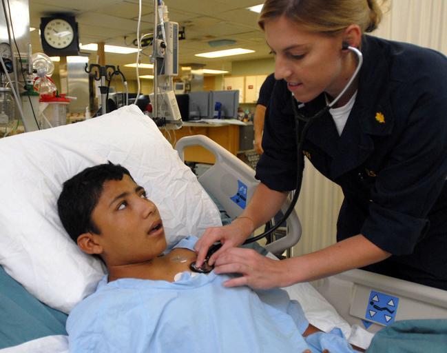 | Keywords: US Navy 070731-N-4238B-007 Lt. Megan Zeller, an intensive care unit nurse, checks the vital signs of patient, while he recovers after surgery aboard the hospital ship USNS Comfort (T-AH 20).jpg  en ACAJUTLA El Salvador July 31 2007 - Lt Megan Zeller an intensive care unit nurse checks the vital signs of patient while he recovers after surgery aboard the hospital ship USNS Comfort T-AH 20 Comfort is on a four-month humanitarian deployment to Latin America and the Caribbean providing medical care for patients in a dozen countries U S Navy photo by Mass Communication Specialist 3rd Class Kelly E Barnes RELEASED 2007-07-31 070731-N-4238B-007 Navy http //www navy mil/view_image asp id 48920 U S Navy photo by Mass Communication Specialist 3rd Class Kelly E Barnes PD-USGov-Military-Navy Anterior chest auscultation Nurses from the United States USNS Comfort in El Salvador 2007 |