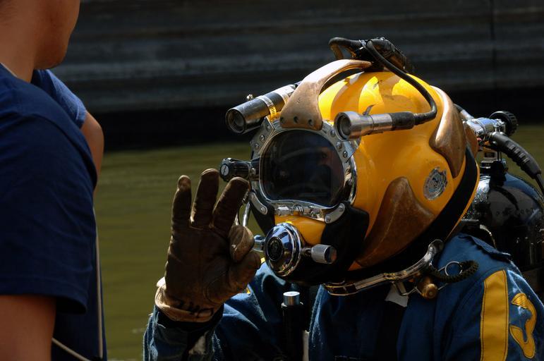 | Keywords: US Navy 070811-N-3093M-021 Chief Navy Diver Scott Maynard attached to Mobile Diving and Salvage Unit (MDSU) 2, readies for a dive into the Mississippi river in support of ongoing search and recovery operations.jpg  en MINNEAPOLIS Minn Aug 11 2007 - Chief Navy Diver Scott Maynard attached to Mobile Diving and Salvage Unit MDSU 2 readies for a dive into the Mississippi river in support of ongoing search and recovery operations MDSU 2 has been in Minneapolis supporting local state and federal officials in the wake of the collapse of the I-35 Bridge U S Navy photo by Senior Chief Mass Communication Specialist Andrew McKaskle RELEASED 2007-08-11 070811-N-3093M-021 Navy http //www navy mil/view_image asp id 49430 U S Navy photo by Senior Chief Mass Communication Specialist Andrew McKaskle PD-USGov-Military-Navy I-35W Mississippi River Bridge collapse United States Navy Mobile Diving and Salvage Unit Two Lightweight demand diving helmets Diving hand signals O gesture with thumb and forefinger United States Navy Divers Diving lights Underwater video equipment |