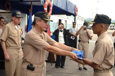 Keywords: US Navy 070823-N-0989H-049 Capt. Douglas Wied, commander of Task Group (TG) 40.9, watches as the Honduran Chief of Naval Operations hands over the ceremonial flag to the commanding officer of the L.P. Guaynauras (FNH-1051).jpg en PUERTO CORTES Honduras Aug 23 2007 - Capt Douglas Wied commander of Task Group TG 40 9 watches as the Honduran Chief of Naval Operations hands over the ceremonial flag to the commanding officer of the L P Guaynauras FNH-1051 a Honduran patrol boat during a ceremony marking the beginning of the ship's participation in PANAMAX 2007 Task Group 40 9 is deployed under the operational control of U S Naval Forces Southern Command for the Global Fleet Station GFS pilot deployment to the Caribbean Basin and Central America The GFS mission is to conduct a broad range of theater security cooperation activities with regional maritime services U S Navy photo by Mass Communication Specialist 1st Class David Hoffman RELEASED 2007-08-23 070823-N-0989H-049 Navy http //www navy mil/view_image asp id 49963 U S Navy photo by Mass Communication Specialist 1st Class David Hoffman PD-USGov-Military-Navy Images from US Navy location Puerto Cortes Honduras PANAMAX 2007