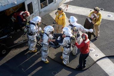 Keywords: US Navy 070918-N-4774B-159 The crash and salvage team aboard amphibious assault ship USS Tarawa (LHA 1) trains for handling an emergency helicopter landing and rescue of wounded personnel.jpg en PACIFIC OCEAN Sept 18 2007 - The crash and salvage team aboard amphibious assault ship USS Tarawa LHA 1 trains for handling an emergency helicopter landing and rescue of wounded personnel Tarawa is participating in a composite unit training exercise with the 11th Marine Expeditionary Unit off the coast of Southern California U S Navy photo by Mass Communication Specialist 3rd Class Daniel A Barker RELEASED 2007-09-18 070918-N-4774B-159 Navy http //www navy mil/view_image asp id 51094 U S Navy photo by Mass Communication Specialist 3rd Class Daniel A Barker PD-USGov-Military-Navy Aboard USS Tarawa LHA-1 Fire proximity suits |