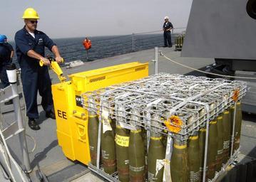 Keywords: US Navy 070918-N-4649C-110 Gunner's Mate 1st Class Matt Kelly loads ordnance onto an elevator aboard Arleigh-Burke class guided-missile destroyer USS Lassen (DDG 82) during an ammunition onload.jpg en YOKOSUKA Japan Sept 18 2007 - Gunner's Mate 1st Class Matt Kelly loads ordnance onto an elevator aboard Arleigh-Burke class guided-missile destroyer USS Lassen DDG 82 during an ammunition onload Low sea state and low winds are just two of the key elements in order to safely complete ammo onload at sea Lassen is underway for a scheduled deployment U S Navy photo by Mass Communication Specialist 2nd Class Chantel M Clayton RELEASED 2007-09-18 070918-N-4649C-110 Navy http //www navy mil/view_image asp id 51012 U S Navy photo by Mass Communication Specialist 2nd Class Chantel M Clayton PD-USGov-Military-Navy United States Fleet Activities Yokosuka Aboard USS Lassen DDG-82 Gunner's Mate Cold War and Modern artillery ammunition 5 /54 caliber Mark 45 gun |