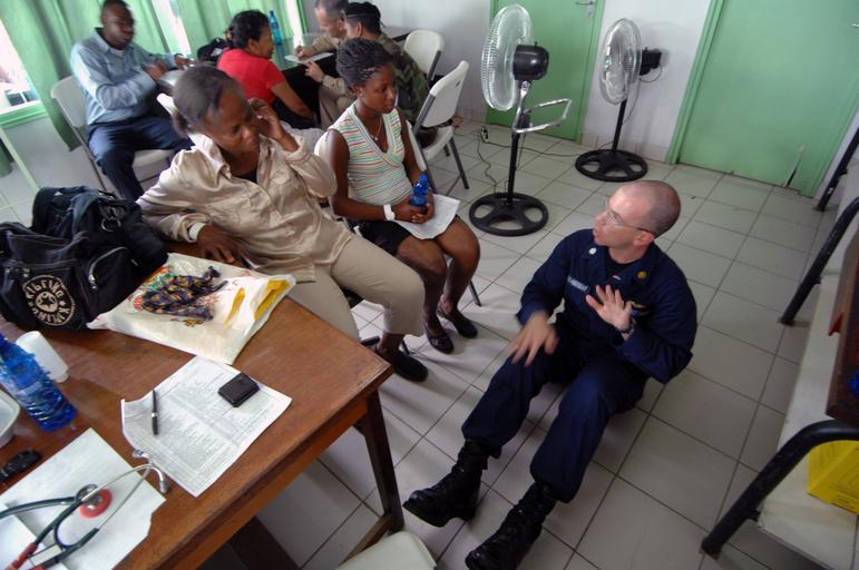 | Keywords: US Navy 071005-N-0194K-137 U.S. Coast Guard Lt. Cmdr. Jeff Salvon-Harman, a doctor with U.S. Public Health Service and attached to the Military Sealift Command hospital ship USNS Comfort (T-AH 20), demonstrates exercises to all.jpg  en PARAMARIBO Republic of Suriname Oct 5 2007 - U S Coast Guard Lt Cmdr Jeff Salvon-Harman a doctor with U S Public Health Service and attached to the Military Sealift Command hospital ship USNS Comfort T-AH 20 demonstrates exercises to alleviate back pain for patients at Flustraat Clinic in Paramaribo Suriname Comfort is on a four-month humanitarian deployment to Latin America and the Caribbean providing medical care to patients in a dozen countries U S Navy photo by Mass Communication Specialist 2nd Class Steven King RELEASED 2007-10-05 071005-N-0194K-137 Navy http //www navy mil/view_image asp id 51620 U S Navy photo by Mass Communication Specialist 2nd Class Steven King PD-USGov-Military-Navy Images from US Navy location PARAMARIBO Suriname Aboard USNS Comfort T-AH-20 |