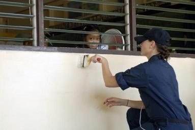 Keywords: US Navy 071030-N-1242B-021 A curious little girl looks on as Operations Specialist 3rd Class Ashley Moore, paints a wall at Barretto Elementary School.jpg en SUBIC BAY Republic of the Philippines Oct 30 2007 - A curious little girl looks on as Operations Specialist 3rd Class Ashley Moore paints a wall at Barretto Elementary School during a friendship building project Sailors were offered a chance to participate in cultural exchanges goodwill-generating activities and build friendships while in port U S Navy photo by Mass Communication Specialist 1st Class Jeffrey H Ballge RELEASED 2007-10-30 071030-N-1242B-021 Navy http //www navy mil/view_image asp id 52361 U S Navy photo by Mass Communication Specialist 1st Class Jeffrey H Ballge PD-USGov-Military-Navy Images from US Navy location Subic Bay Republic of the Philippines |