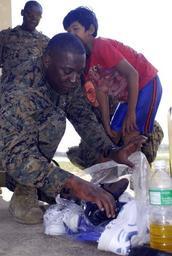 Keywords: US Navy 071128-N-4010S-286 Maj. Jeramy Green searches through a bag of donated shoes for a young Cambodian boy.jpg en PHNOM PENH Kingdom of Cambodia Nov 28 2007 Maj Jeramy Green assigned to the Command Element of the 31st Marine Expeditionary Unit aboard the amphibious assault ship USS Essex LHD 2 searches through a bag of donated shoes for a young Cambodian boy Essex and the embarked 31st Marine Expeditionary Unit MEU are in Sihanoukville Kingdom of Cambodia for a scheduled port visit that gives Sailors and Marines the opportunity to participate in friendship-building community relations events medical and dental projects and professional exchanges Essex is the lead ship of the only forward-deployed U S Expeditionary Strike Group and serves as the flagship for CTF 76 the Navy's only forward-deployed amphibious force commander Task Force 76 is headquartered at White Beach Naval Facility Okinawa Japan with a detachment in Sasebo Japan U S Navy photo by Chief Mass Communication Specialist Ty Swartz Released 2007-11-28 071128-N-4010S-286 Navy http //www navy mil/view_image asp id 53254 U S Navy photo by Chief Mass Communication Specialist Ty Swartz PD-USGov-Military-Navy United States Navy in Phnom Penh |