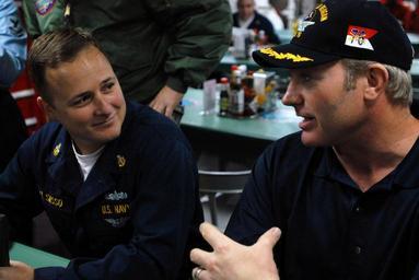 | Keywords: US Navy 071213-N-3659B-164 Senior Chief Cryptologic Technician (Technical) Gerald Del Sasso talks with retired National Hockey League star Marty McSorley on the aft mess decks of the Nimitz-class nuclear-powered aircraft carrie.jpg en PACIFIC OCEAN Dec 13 2007 Senior Chief Cryptologic Technician Technical Gerald Del Sasso talks with retired National Hockey League star Marty McSorley on the aft mess decks of the Nimitz-class nuclear-powered aircraft carrier USS Ronald Reagan CVN 76 McSorley visited with Ronald Reagan Sailors and took part in an autograph session while aboard as part of the Commander Naval Air Forces distinguished visitors program Reagan is underway conducting tailored ship's training assessment U S Navy photo by Mass Communication Specialist 2nd Class Joseph M Buliavac Released 2007-12-13 071213-N-3659B-164 Navy http //www navy mil/view_image asp id 53841 U S Navy photo by Mass Communication Specialist 2nd Class Joseph M Buliavac PD-USGov-Military-Navy Blue clothing male Cryptologic Technician December 2007 Del Sasso surname Hand gestures in conversation Images from US Navy location PACIFIC OCEAN Males with baseball caps Marty McSorley Men facing left and looking left Men facing left and looking right Mess decks of USS Ronald Reagan CVN-76 Military people in 2007 People of Canada in 2007 People of the United States in 2007 Pictures by Mass Communication Specialists Sailors from the United States Navy Smiling men Taken with Nikon D200 2007 photographs 21st-century men of the United States 13 December |