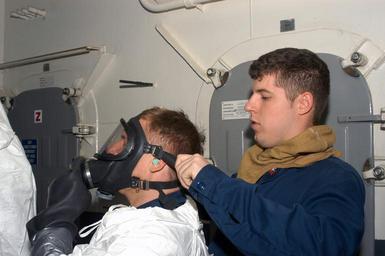 | Keywords: US Navy 071223-N-5033P-012 Damage Controlman 2nd Class Petty Officer Nathan Stachey assists a Sailor in donning an in-line Self Contained Breathing Apparatus during a simulated toxic gas casualty drill.jpg en PERSIAN GULF Dec 23 2007 Damage Controlman 2nd Class Petty Officer Nathan Stachey assists a Sailor in donning an in-line Self Contained Breathing Apparatus during a simulated toxic gas casualty drill for a Unit Level Training Readiness Assessment-Sustainment ULTRA-S exercise aboard the amphibious assault ship USS Kearsarge LHD 3 Kearsarge is on a regularly scheduled deployment in support of maritime security operations U S Navy photo by Mass Communication Specialist Seaman Derek Poole Released 2007-12-23 071223-N-5033P-012 Navy http //www navy mil/view_image asp id 54159 U S Navy photo by Mass Communication Specialist Seaman Derek Poole PD-USGov-Military-Navy Damage Controlman Aboard USS Kearsarge LHD-3 Self-contained breathing apparatus Gas masks of the United States |