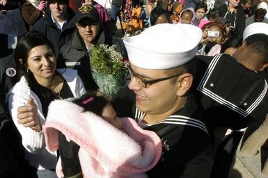| Keywords: US Navy 080125-N-0486G-007 Culinary Specialist 2nd class Eber Varrazh hugs his newborn baby girl for the first time after he walked off the brow of The Guided-Missile Cruiser USS Vicksburg (CG 69).jpg  en MAYPORT Fla Jan 25 2008 Culinary Specialist 2nd class Eber Varrazh hugs his newborn baby girl for the first time after he walked off the brow of The Guided-Missile Cruiser USS Vicksburg CG 69 Vicksburg returned home to Naval Station Mayport after a six-month Persian Gulf deployment U S Navy photo by Mass Communication Specialist 2nd Class Daniel Gay Released 2008-01-25 080125-N-0486G-007 Navy http //www navy mil/view_image asp id 54789 U S Navy photo by Mass Communication Specialist 2nd Class Daniel Gay PD-USGov-Military-Navy Culinary specialist United States Navy Naval Station Mayport USS Vicksburg CG-69 |