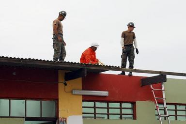 Keywords: US Navy 080614-N-6410J-026 Seabees assigned to Construction Battalion Maintenance Unit (CBMU) 303 embarked aboard the amphibious assault ship USS Boxer (LHD 4), work with a Peruvian construction worker to replace the roof on a.jpg en BARRANCA Peru June 14 2008 Seabees assigned to Construction Battalion Maintenance Unit CBMU 303 embarked aboard the amphibious assault ship USS Boxer LHD 4 work with a Peruvian construction worker to replace the roof on a building at the Guillermo Enrique Billinghurst school in Barranca Peru Boxer is deployed supporting the Pacific phase of Continuing Promise 2008 an equal-partnership mission between the United States Guatemala El Salvador and Peru U S Navy photo by Mass Communication Specialist 3rd Class Matthew Jackson Released 2008-06-14 080614-N-6410J-026 Navy http //www navy mil/view_image asp id 60415 U S Navy photo by Mass Communication Specialist 3rd Class Matthew Jackson PD-USGov-Military-Navy Lima Region Aboard USS Boxer LHD-4 United States Navy in Peru |