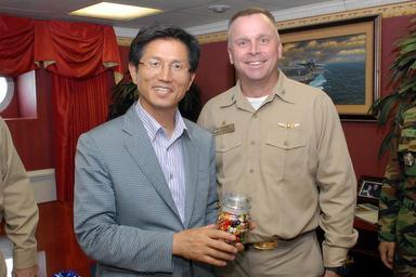 | Keywords: US Navy 080713-N-1635S-003 Capt. Kenneth J. Norton, commanding officer of the Nimitz-class aircraft carrier USS Ronald Reagan (CVN 76), presents a gift of jellybeans to Governor Moon Soo Kim.jpg en PACIFIC OCEAN July 13 2008 Capt Kenneth J Norton commanding officer of the Nimitz-class aircraft carrier USS Ronald Reagan CVN 76 presents a gift of jellybeans to Governor Moon Soo Kim of Kyong Gi Do Province Republic of Korea ROK ROK government and military officials spent the day touring the ship to experience shipboard operations The Ronald Reagan Carrier Strike Group is on a scheduled deployment in the 7th Fleet area of responsibility operating in the western Pacific and Indian oceans U S Navy photo by Mass Communication Specialist 3rd Class Joshua Scott Released 2008-07-13 080713-N-1635S-003 Navy http //www navy mil/view_image asp id 61333 U S Navy photo by Mass Communication Specialist 3rd Class Joshua Scott PD-USGov-Military-Navy Kenneth J Norton Captain's cabin of USS Ronald Reagan CVN-76 Jelly beans Guests aboard USS Ronald Reagan CVN-76 Kim Moon-Soo |