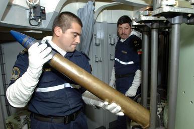 | Keywords: US Navy 080720-N-3931M-078 Cpl. Boris Rojas loads an ammunition into the magazine of a 76 mm gun aboard the Chilean navy frigate CS Riveros (FF18) during a Rim of the Pacific (RIMPAC) 2008 exercise off the coast of Hawaii.jpg en PACIFIC OCEAN July 20 2008 Cpl Boris Rojas loads an ammunition into the magazine of a 76 mm gun aboard the Chilean navy frigate CS Riveros FF18 during a Rim of the Pacific RIMPAC 2008 exercise off the coast of Hawaii RIMPAC is the world's largest multinational exercise and is scheduled biennially by the U S Pacific Fleet Participants include Australia Canada Chile Japan Netherlands Peru Republic of Korea Singapore United Kingdom and the United States U S Navy photo by Mass Communication Specialist 1st Class Michael R McCormick Released 2008-07-20 080720-N-3931M-078 Navy http //www navy mil/view_image asp id 61699 U S Navy photo by Mass Communication Specialist 1st Class Michael R McCormick PD-USGov-Military-Navy Images from US Navy location PACIFIC OCEAN Almirante Riveros FF 18 Cold War and Modern artillery ammunition 76 mm Otobreda Otobreda 76 mm Ammunition |