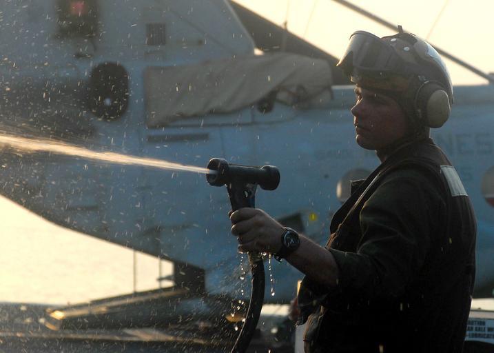 Keywords: US Navy 080723-N-5148B-003 Cpl. Mathew Roberts gives a helicopter a fresh-water wash down.jpg en ARABIAN GULF JULY 23 2008 Marine Corps Cpl Mathew Roberts gives a helicopter a fresh-water wash down on the flight deck aboard the amphibious assault ship USS Peleliu LHA 5 Peleliu is currently deployed in support of Maritime Security Operations in the Navy's 5th Fleet area of responsibility U S Navy photo by Mass Communication Specialist 3rd Class Sarah E Bitter/Released 2008-07-23 080723-N-5148B-003 Navy http //www navy mil/view_image asp id 61805 U S Navy photo by Mass Communication Specialist 3rd Class Sarah E Bitter PD-USGov-Military-Navy Aboard USS Peleliu LHA-5