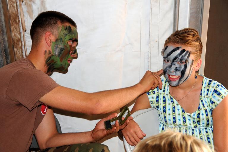 | Keywords: US Navy 080802-N-1424C-460 hip's Serviceman Seaman Steven Day paints camouflage face paint on a visitor.jpg en CAMP PENDLETON Calif August 2 2008 Ship's Serviceman Seaman Steven Day assigned to Amphibious Construction Battalion ACB 1 paints camouflage face paint on a visitor on family day during Exercise Pacific Strike 2008 at Red Beach in Camp Pendleton Pacific Strike 2008 is a Joint Logistics Over-The-Shore JLOTS engineering and logistical training exercise between Army and Navy units under a joint force commander as a means to load and unload ships without the benefit of deep draft-capable fixed port facilities U S Navy photo by Mass Communication Specialist 2nd Class Brian P Caracci/Released 2008-08-02 080802-N-1424C-460 Navy http //www navy mil/view_image asp id 62168 U S Navy photo by Mass Communication Specialist 2nd Class Brian P Caracci PD-USGov-Military-Navy Marine Corps Base Camp Pendleton Joint Logistics Over The Shore Camouflage facepainting |